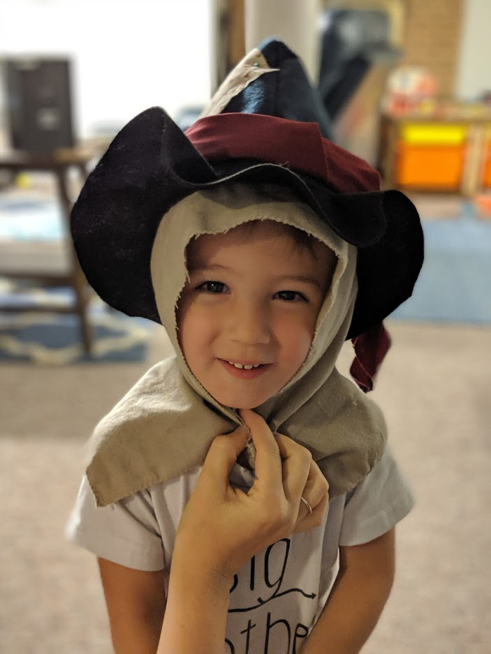 The hat was simple; I measured Rami's head, used a pot lid to make a perfect circle, and then measured a piece of felt that would be wide enough for the top of the hat. I sewed a patch on the hat and used a spare piece of fabric as a little "belt" around the hat. Easy!
