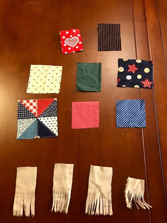 I then took a bunch of fabrics I got from my aunt after my grandma passed away, and cut them into little squares to sew on for patches. I also used the brown flannel to make little pieces of "straw" to stick out the sides of the patches.