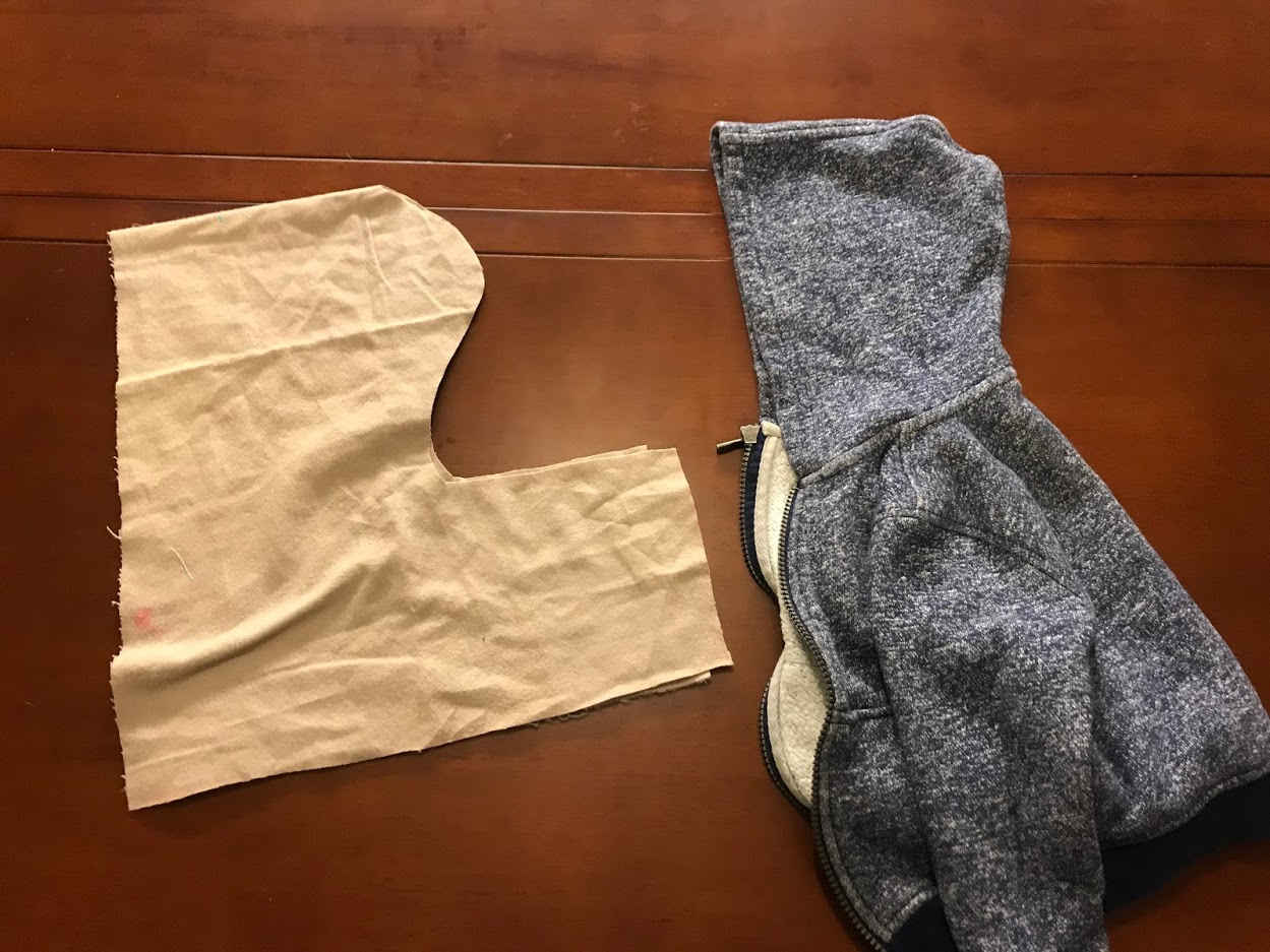 It didn't take long to sew on all the patches. That was the easy part! Next, I used a piece of the brown flannel and cut it out as a hood to match Rami's sweatshirt hood.