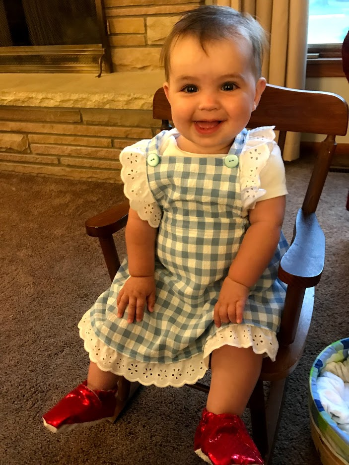 Saira's Dorothy costume would be a bit more involved. I didn't think I could just mock up a Dorothy costume all on my own, so I found a pinafore costume on Pinterest and just used my gingham to make it! I then used lace on the edges and had a little Dorothy dress for my girl!