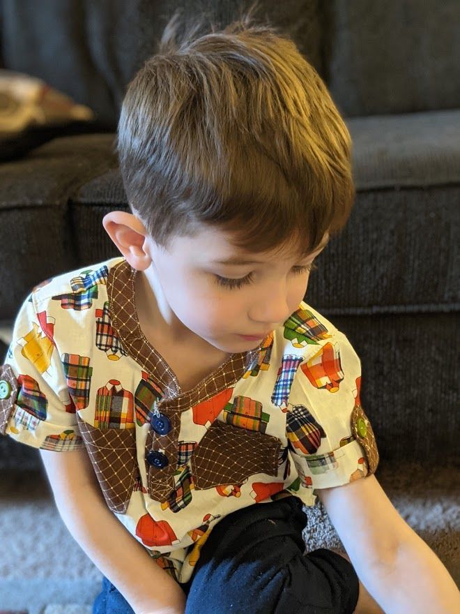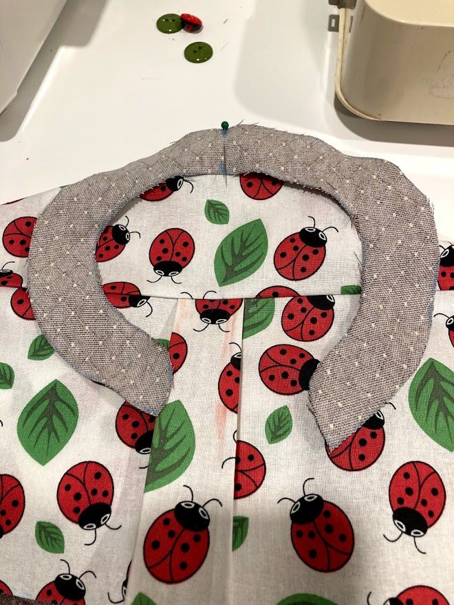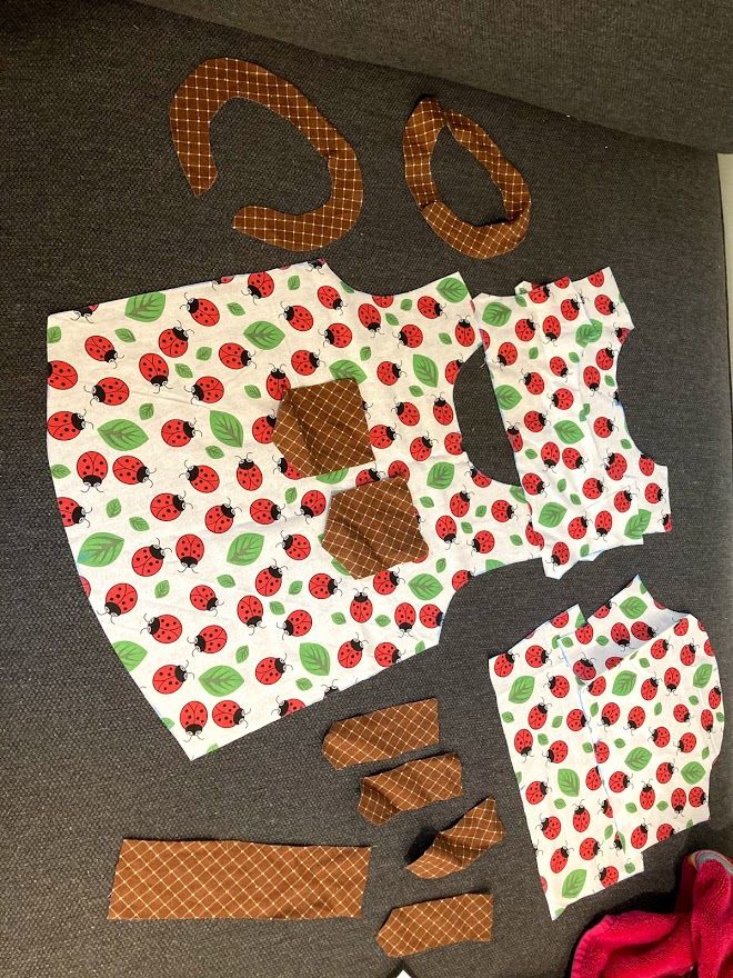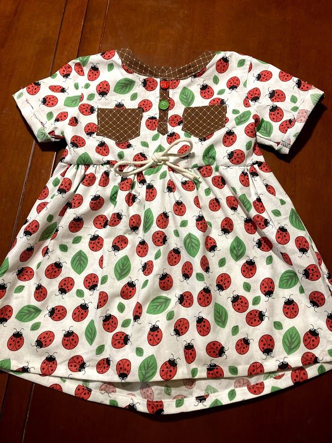 She picked out her own ladybug fabric from Joann Fabrics, and I used the same brown fabric with white dots for the accents that I did for Rami's shirt shirt.
