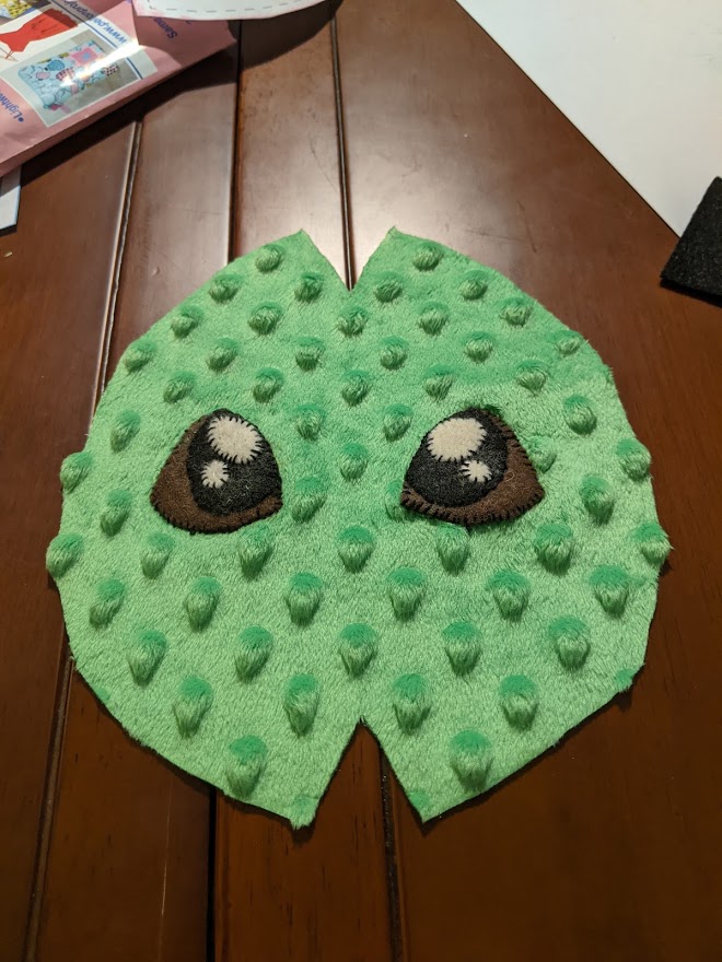 The pattern was fairly easy to understand, so I cut out my pieces and began to assemble. By far the hardest part was figuring out the eyes. I had never used fusible web, and actually purchased the wrong thing when I went to Joann Fabrics. Oops. I ended up just hand-sewing the eye pieces after pinning them on, and I think they turned out fine.