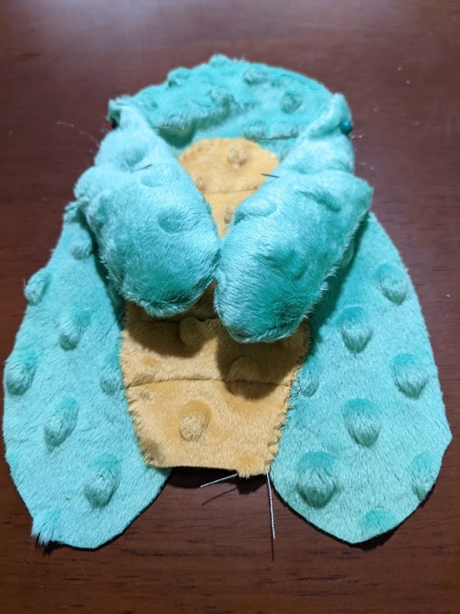 I purchased some dimpled minky fabric in light blue, dark yellow, and lime green, for the different parts of my dragon. I decided for the middle heart, I would use some left over maroon sweatshirt fabric from my joggers project.