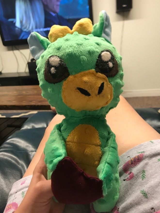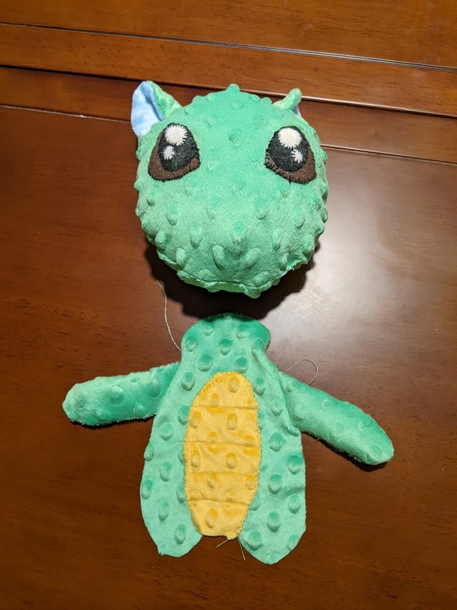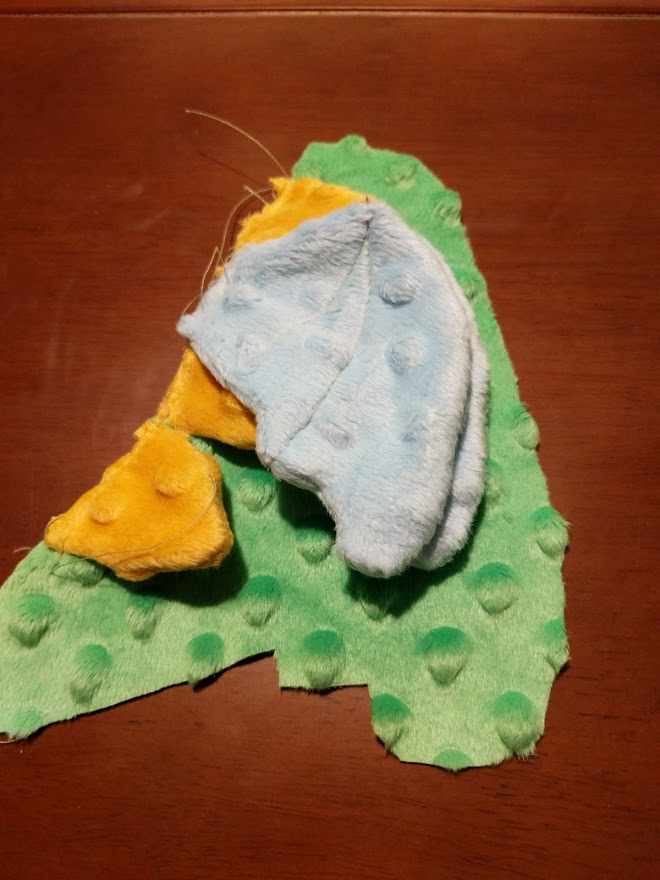 As I added each feature, the dragon started to come together. I'm really excited for what Rami might name him. He has a stuffed cat that he named "Police Car" and a stuffed wolverine that he named "Boy." I knew the hardest part for me would be hand-sewing the head on. Once everything is stuffed, it's just hard to maneuver to get everything on straight. I persevered though, and even though it did turn out somewhat crooked, I think it mostly works.