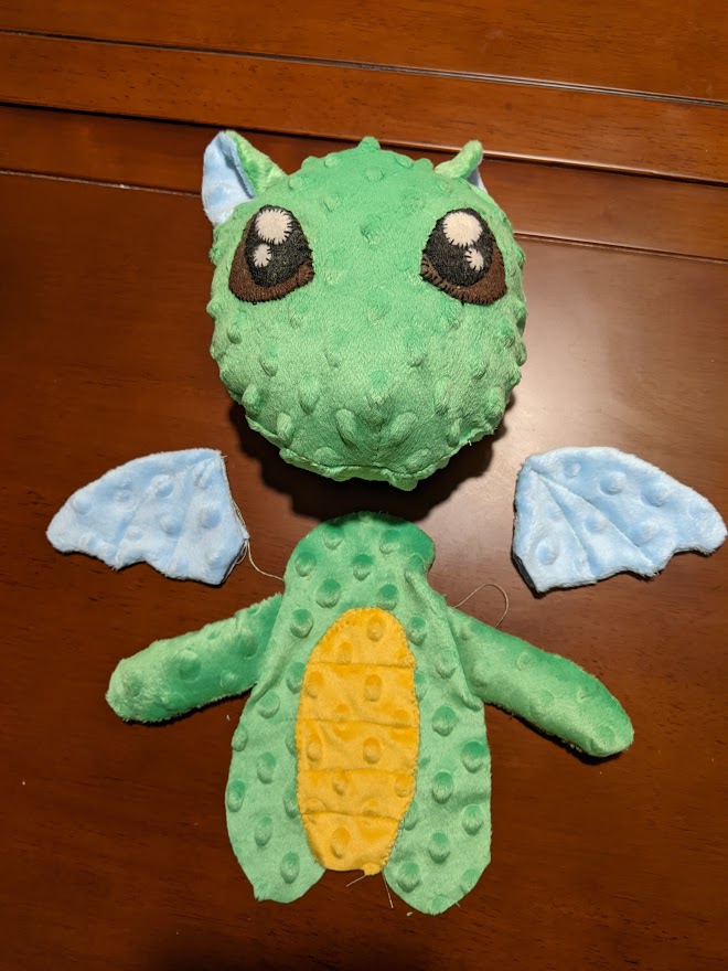 I enjoyed attaching all the pieces together, as though I was going through a checklist of what needed to be added to a dragon. "Okay, body, head...uh, eyes, wings, oops arms and legs, tail? Got it." I was very nervous about how it might turn out, as I've never really made a detailed plushie like this before.