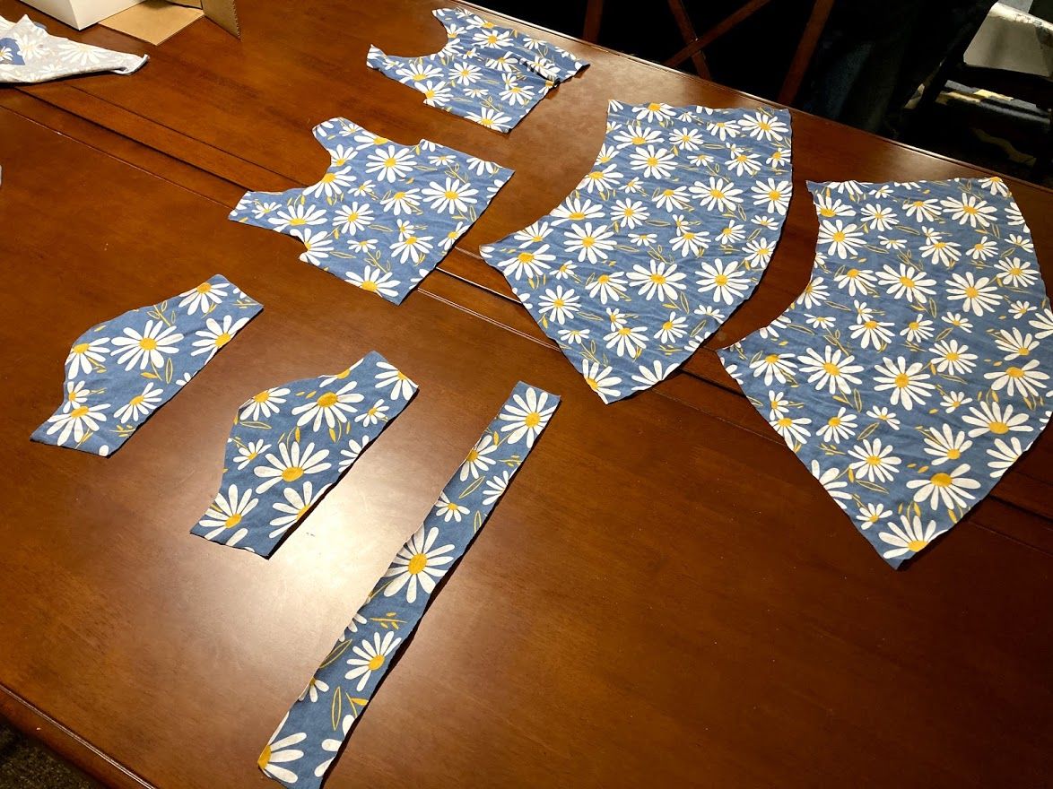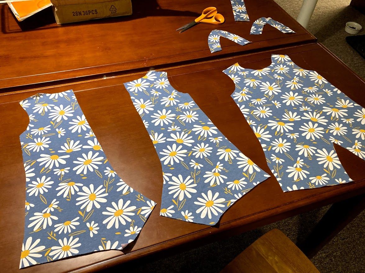 With my patterns decided upon, I took Saira to Joann's and let her look at all the fabrics. I told her she could pick anything she wanted. I was initially nervous because she was hovering around some weird Christmas dinosaur fabrics (these were supposed to be spring dresses!) but she eventually saw the flower fabrics and chose a cute daisy fabric.