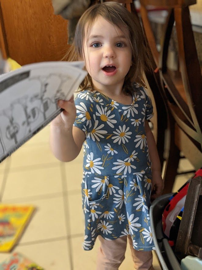 From that point on, she was obsessed with the daisy fabric. She also noticed that a lot of my dresses have pockets, so her go-to phrase became: "Daisy dress! Pockets!"