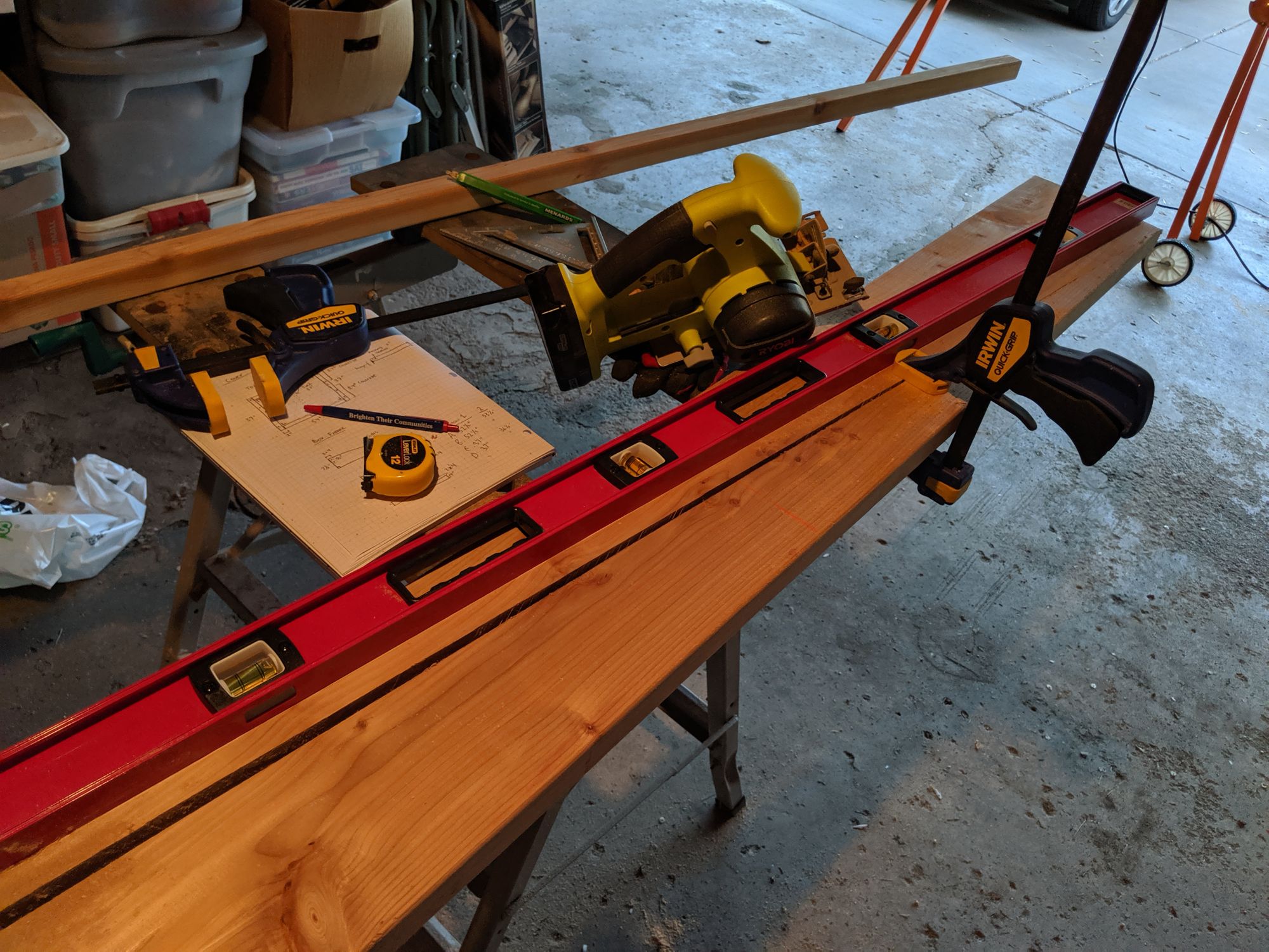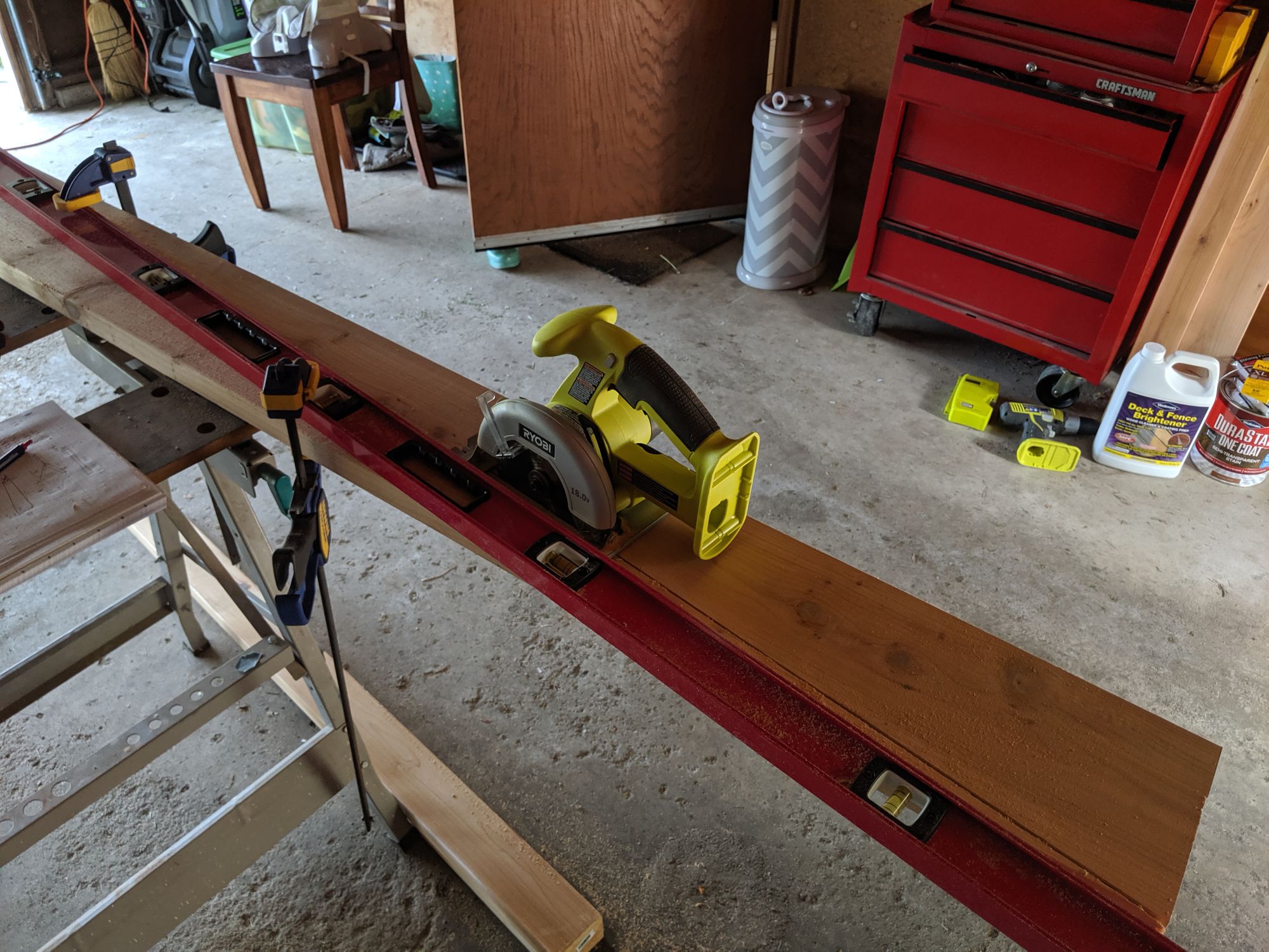 This was the most challenging cut for me because I don't have a table saw. Instead what I did was set up some clamps and a 72" level (best purchase in awhile!) so that I could use my skillsaw to follow the edge and cut a straight line through the wood. I'm happy to report that even a small 6" skillsaw will work but it won't be a super clean cut. I'd definitely recommend a larger blade if you have one.