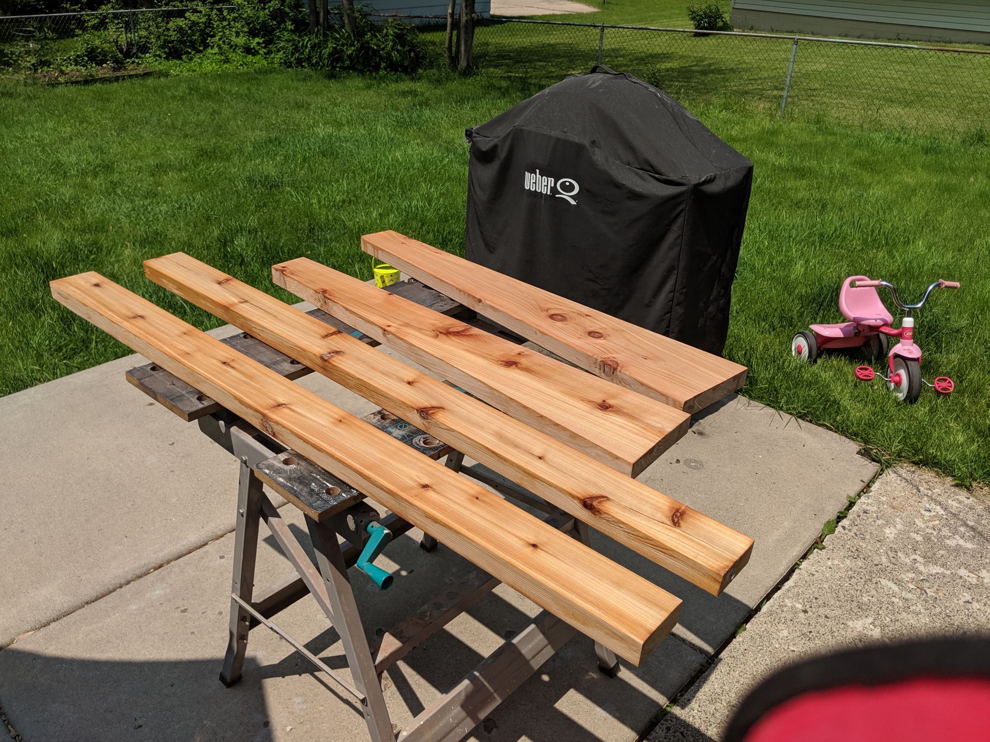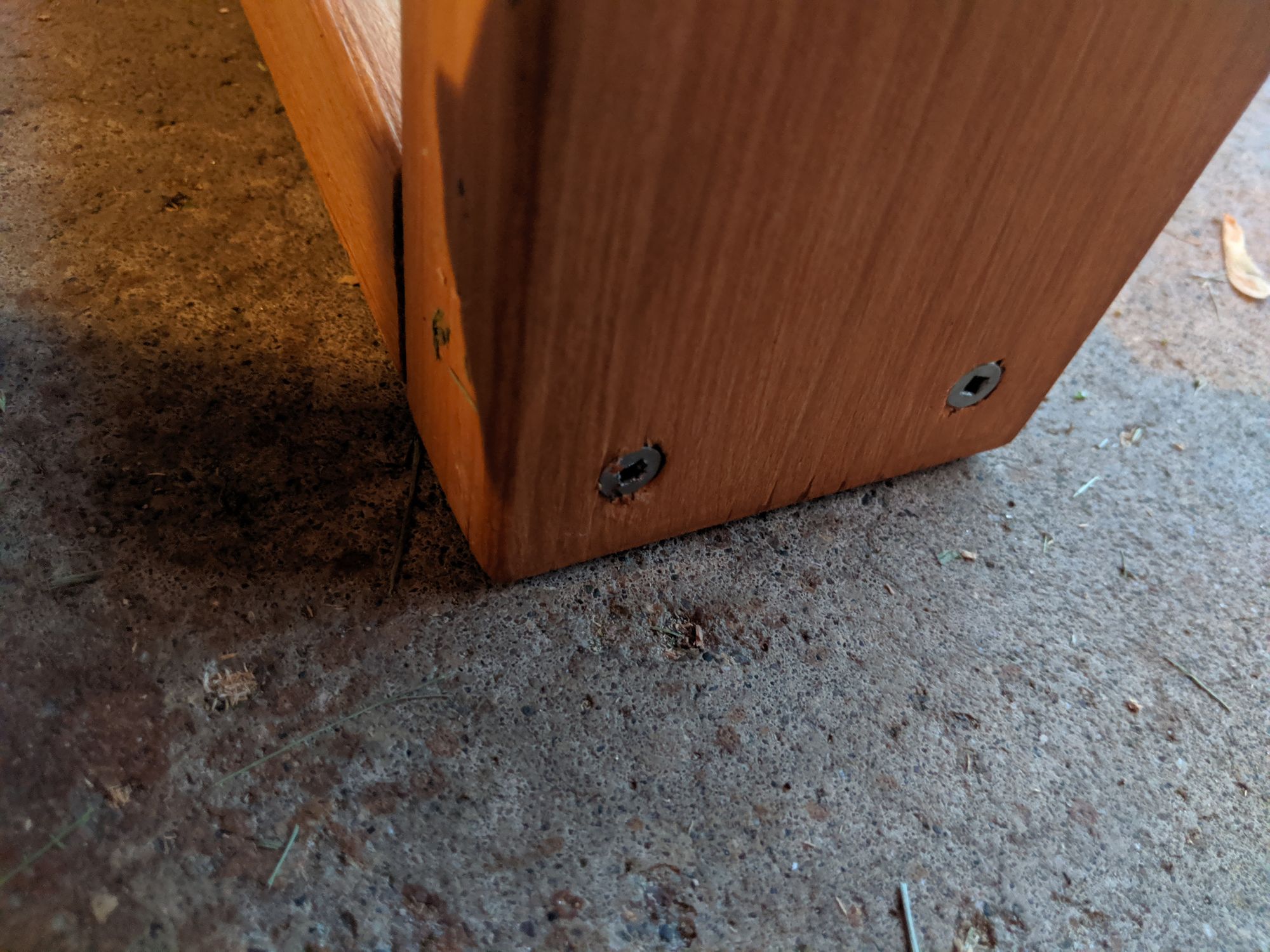 If you're using cedar, when exposed to the elements it will start to turn that weathered gray. When I started this project I never knew that but it explains why so many decks and outdoor projects turn grey over time. I prefer the "natural" red look of cedar myself. If you're like me and don't want grey wood, the advice is to use a single coat of semi-stain which will need to be reapplied every 4-5 years or so to maintain protection against UV. By the way, if you're treating a deck it might better to use sealer rather than stain.