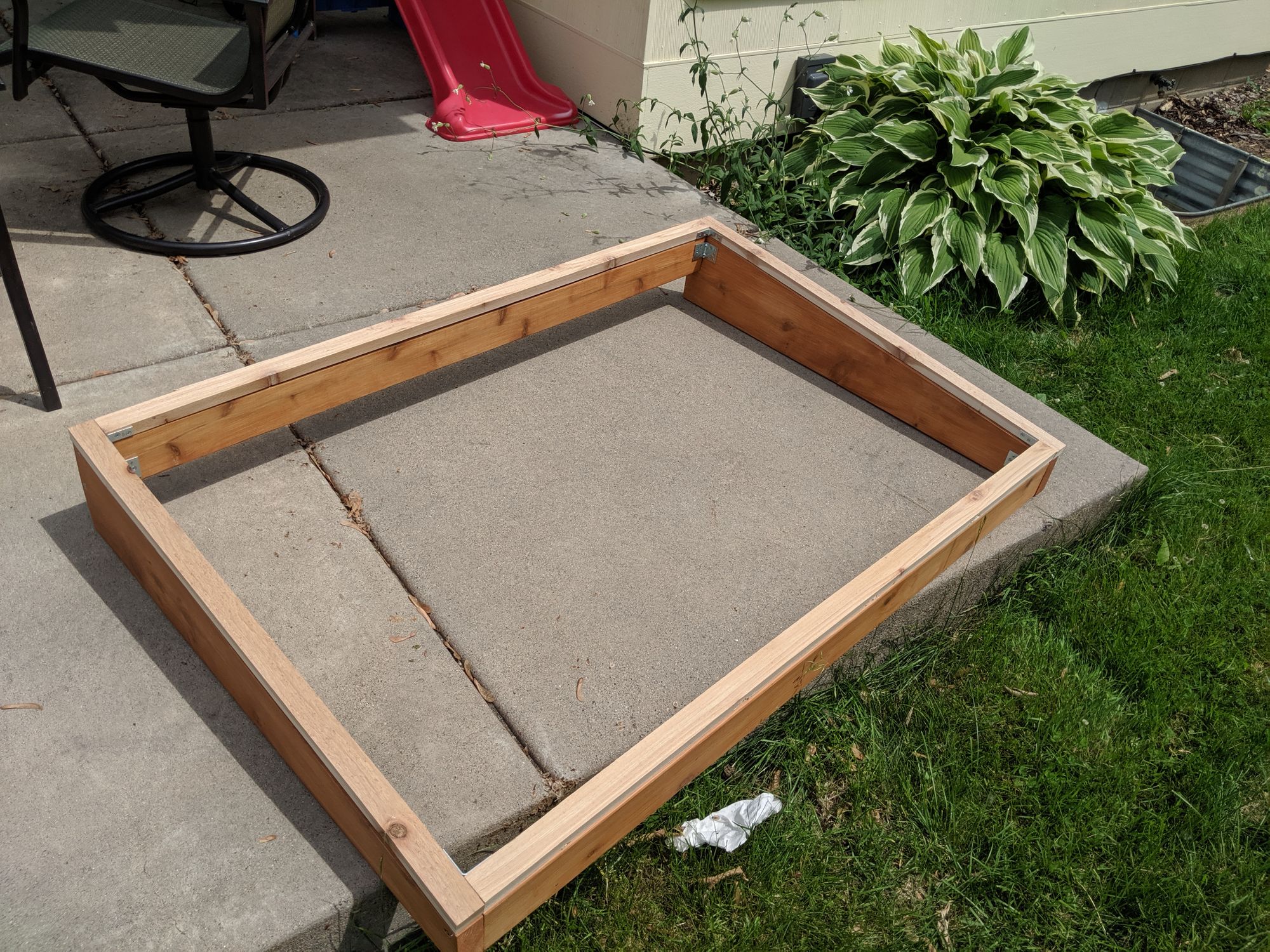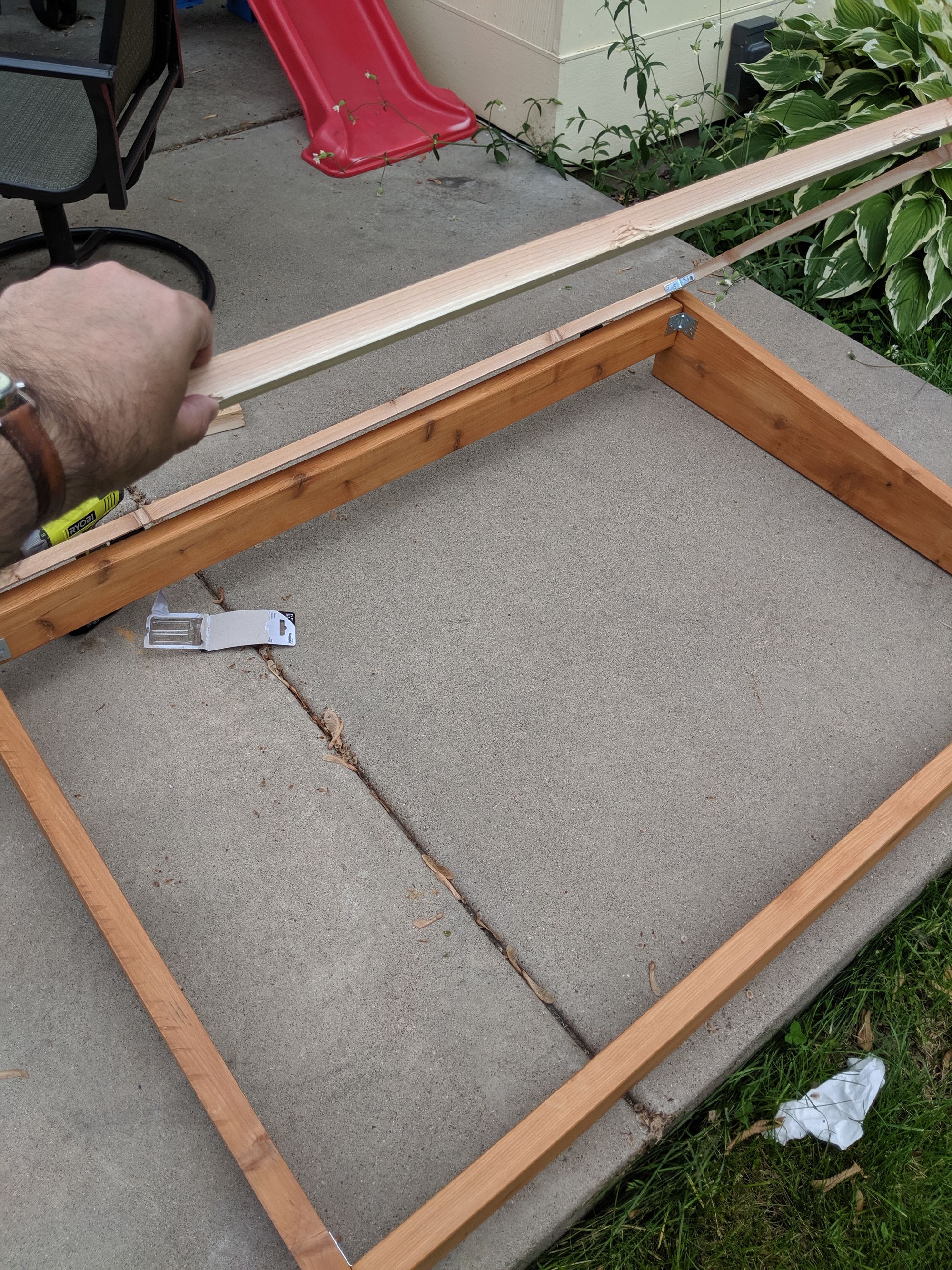 The cover frame is assembled similarly to the base frame except I chose not to use deck screws and rely on braces only since it was using thinner 2x1 boards.