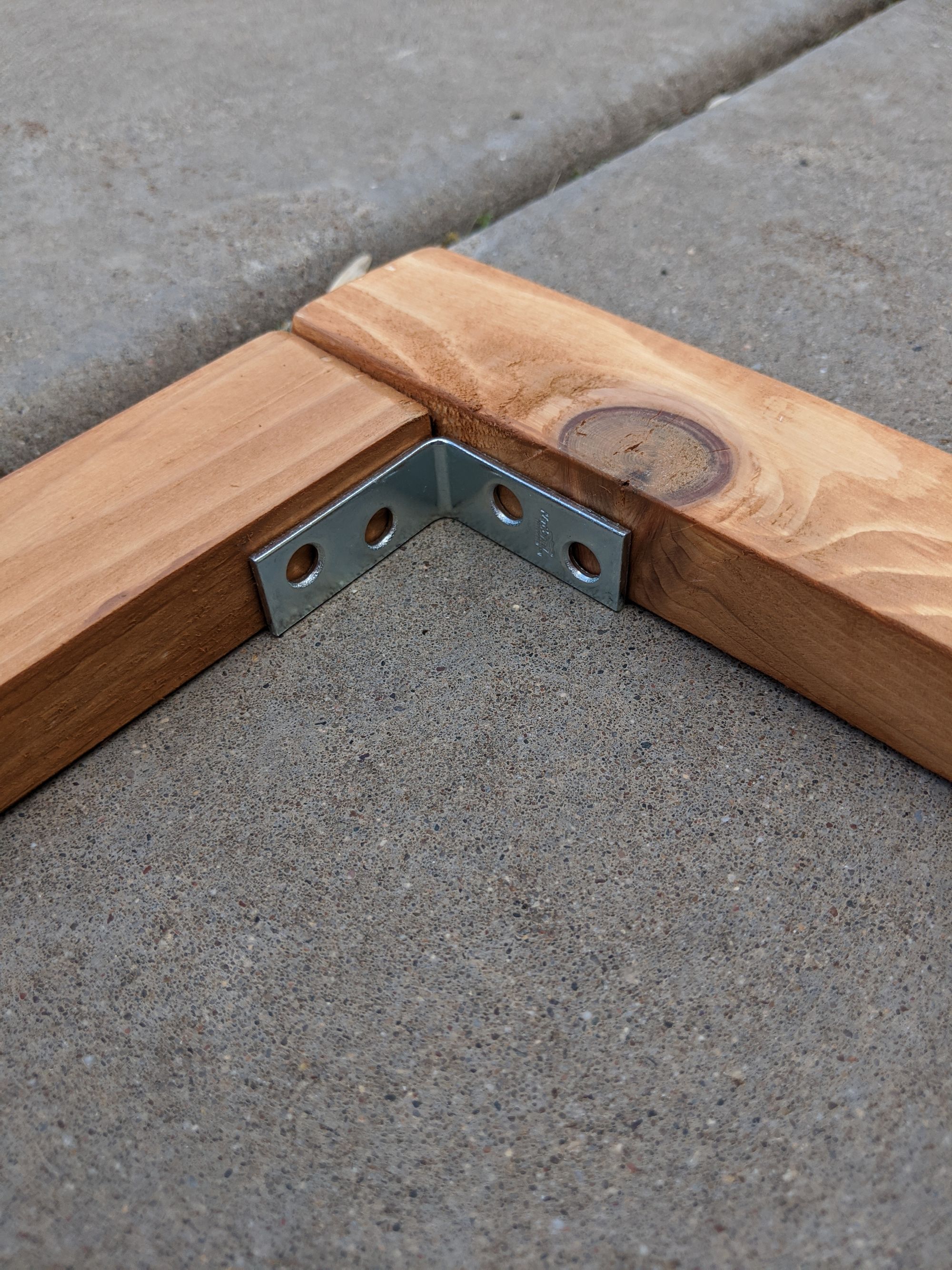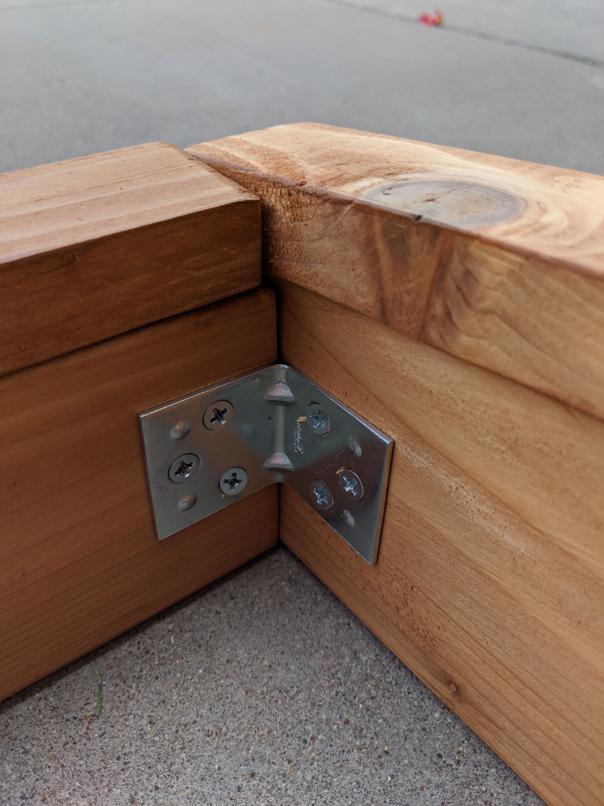 This isn't too difficult. Take the 2x4 pieces and side 2x8 (or whatever you chose) and screw them together using the deck screws (2 screws for each side of the 2x4s). Cedar is prone to splitting so I advise pre-drilling first with a smaller bit and then screwing. Once they're screwed in, use corner braces inside to add some stability. Those screws for the braces are small enough I didn't bother pre-drilling and it doesn't need to be exactly aligned. Aesthetically, I'd have preferred black braces but didn't find any suitable precoated ones and I didn't want to spray them.