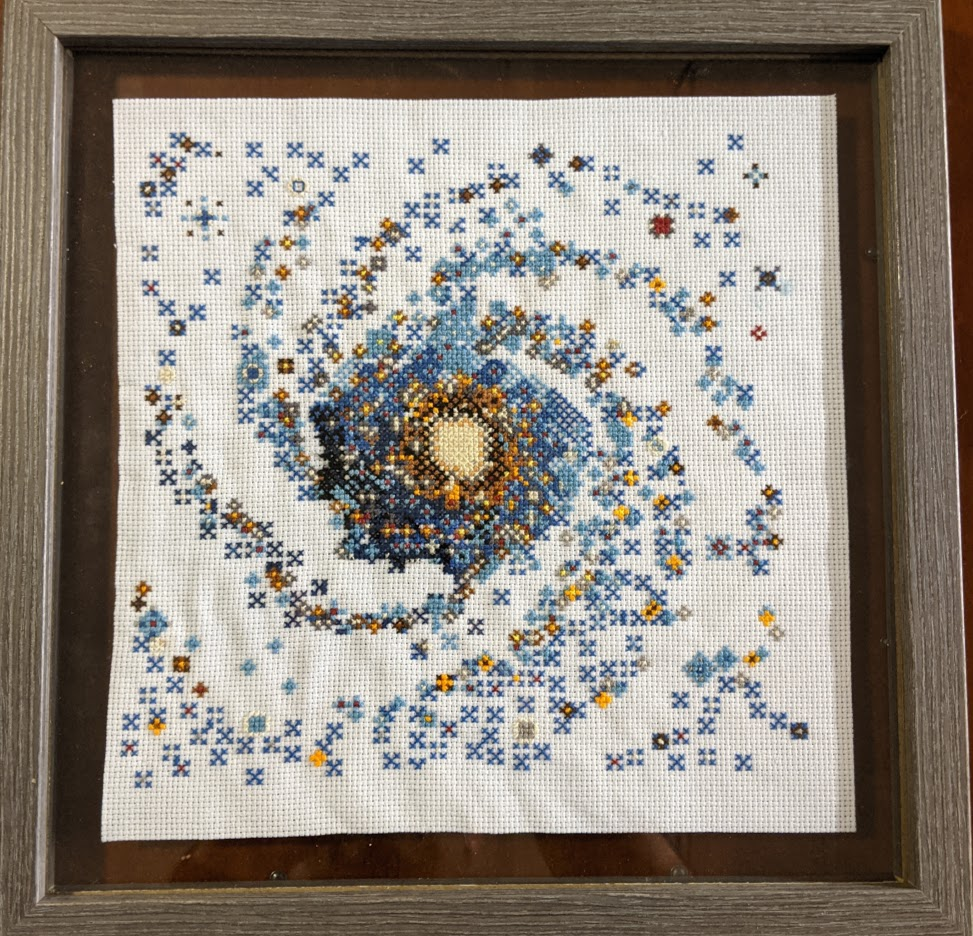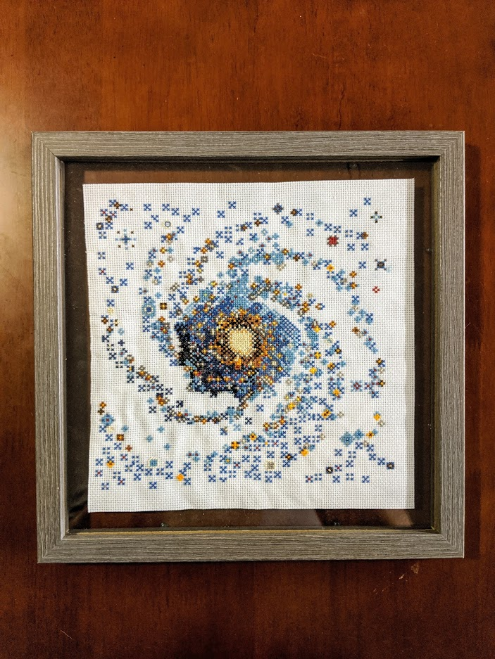 It was the perfect idea! The space pictures are in 8-bit form, so they make the perfect charts for cross-stitching. I looked through the pictures and chose the Pinwheel Galaxy. It's such a cool and whimsical presentation of a galaxy. I really admire my friend's ability to do art like this. Like I've said before, the only type of art I really feel confident in for myself is fiber arts. I am truly in awe of someone like Sara who can create things like this!