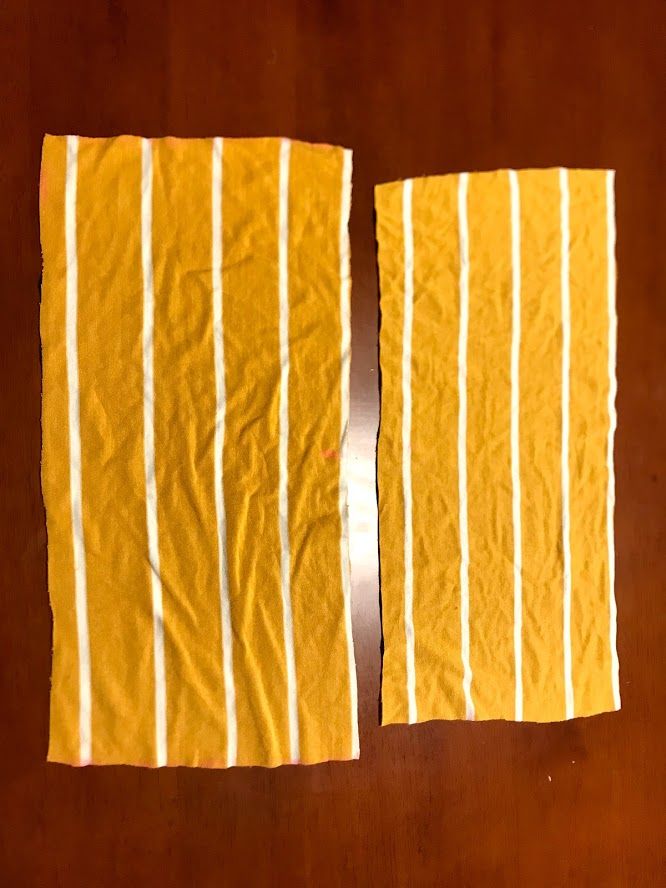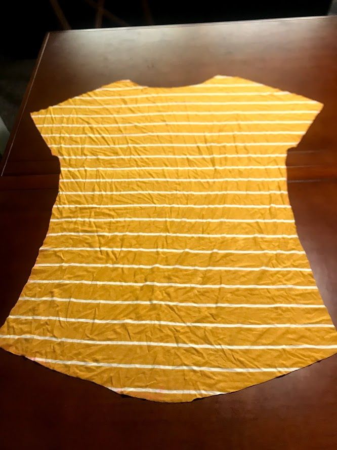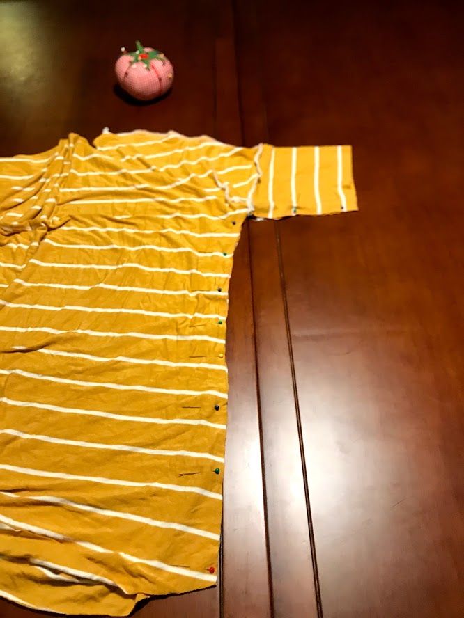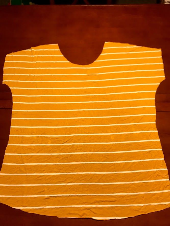 Somehow my two strips ended up being slightly different sizes, so I had to trim the left-most one to fit the other. You may notice that my cut pieces are also shorter than the actual sleeves of the original shirts. The original shirts are 3/4 sleeves; I have included a pattern for the 3/4 sleeve shirt as well as a cut line for a half sleeve. A neckline piece is also needed; I used It's Always Autumn's wonderful article about t-shirt necklines to measure and cut out the neckline piece. I believe it was 4 x 18 inches. Please note that my pattern includes a 0.5 inch seam.