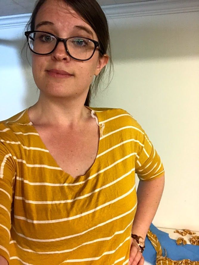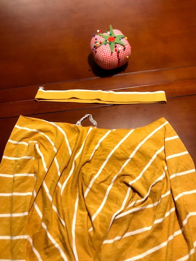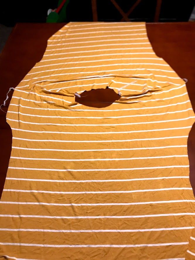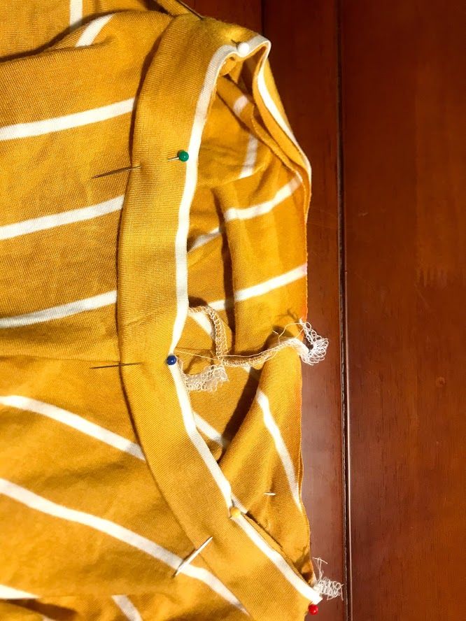 Lastly, I used It's Always Autumn's t-shirt neckline tutorial again, which has helped me with previous projects, and cut out a rectangle of fabric that was 4 by 18 inches. Then I pinned the neckline to the shirt, stretched it as I sewed, and it was attached! It really is so much easier than I ever imagined it would be.