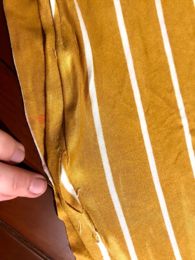 It seemed easy enough, though I was still pretty nervous. I tend to get nervous when trying new things on my machines, especially when the project so far had been pretty successful. Apparently this time I was right to be nervous! After I pinned the hem and flipped it the way I thought it was supposed to be, I easily sewed it under with my serger and thought it was a pretty great hem! Until I realized...I had hemmed it backwards, and the hem was facing outward! I was so mad I had to take a break from sewing for that afternoon. I had just totally destroyed all my hard work! It was incredibly frustrating.