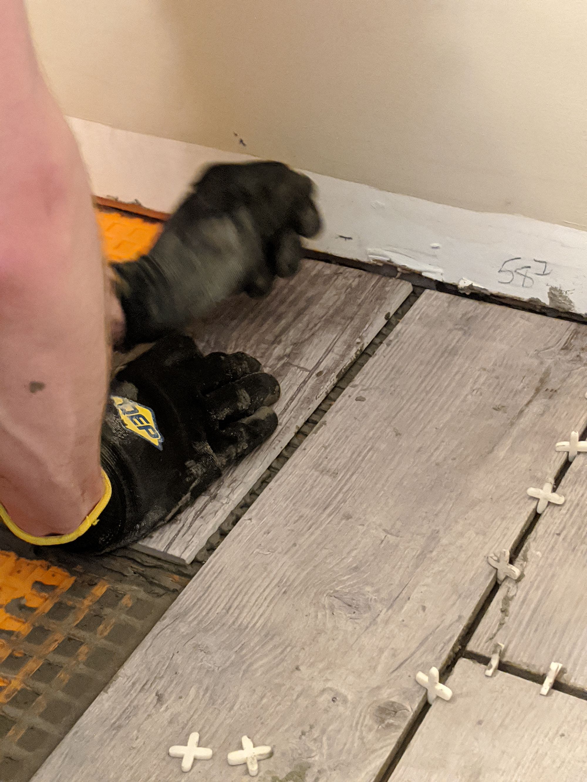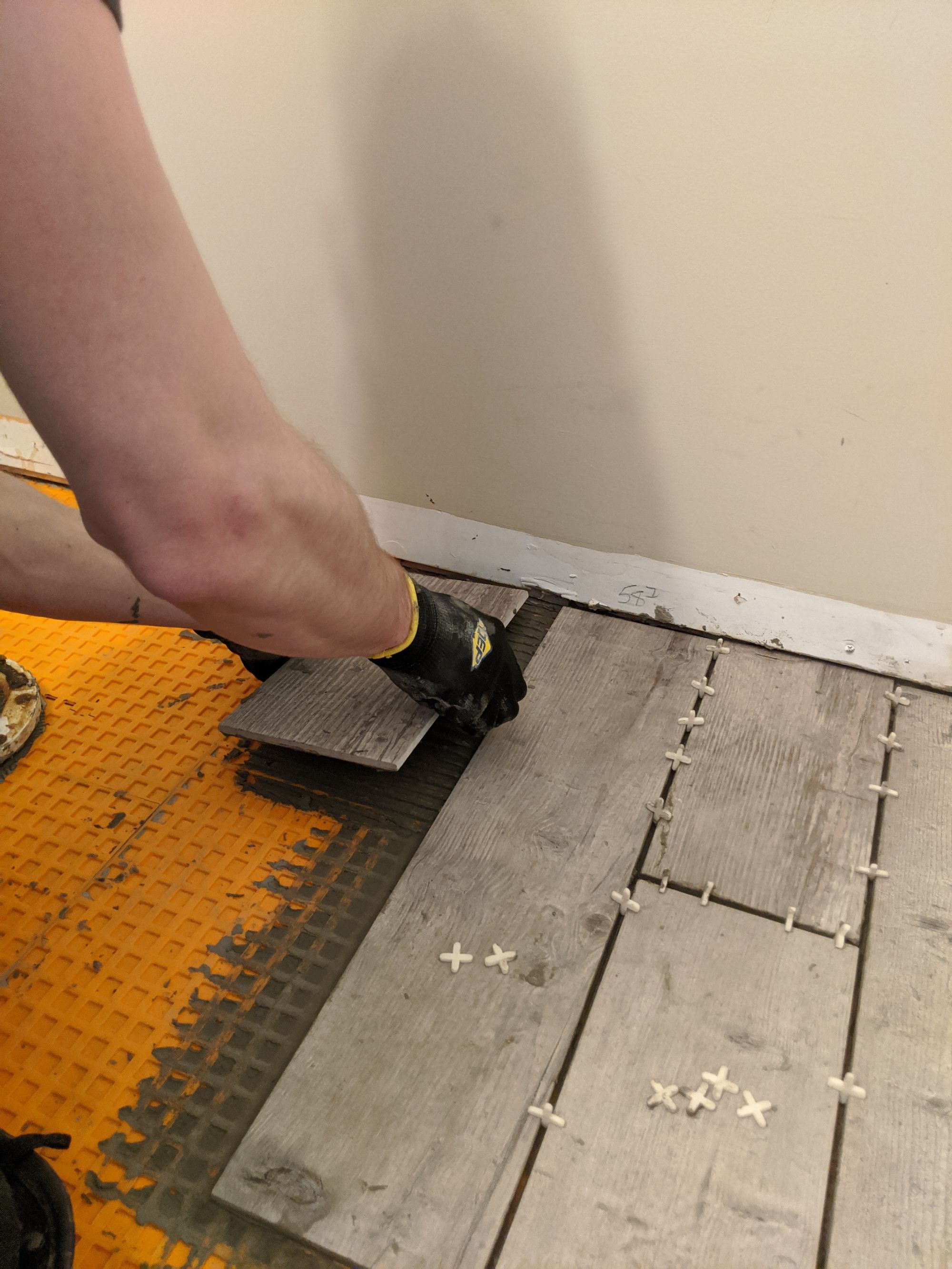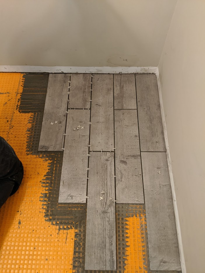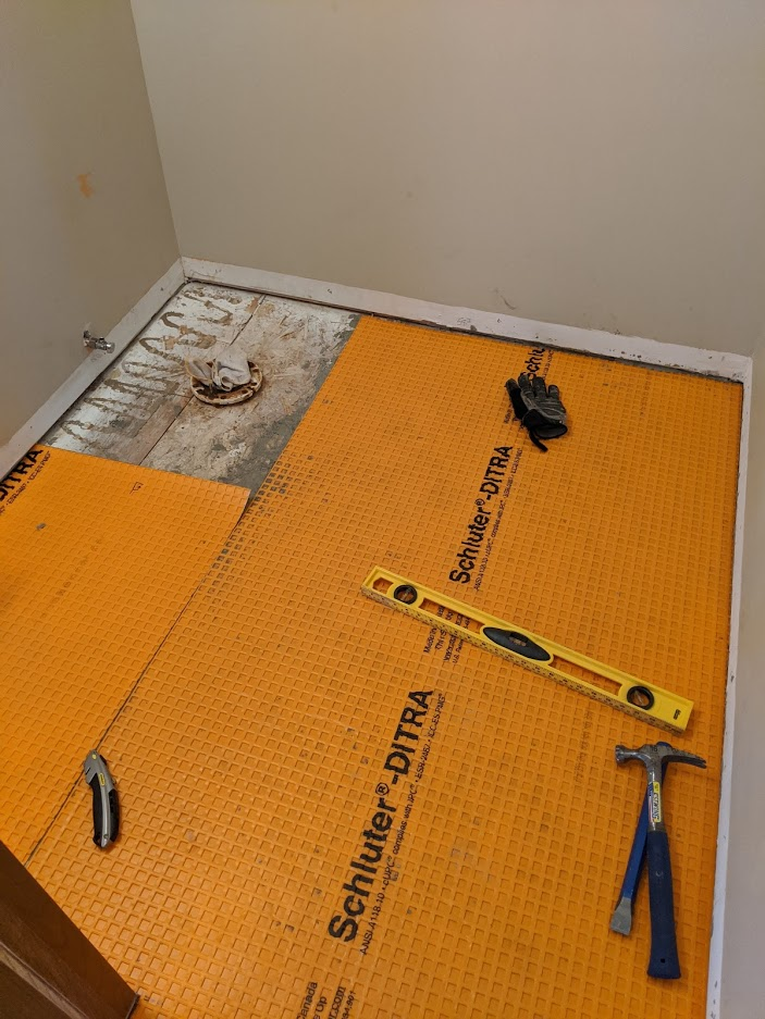 We spent most of the time on day 1 with the DITRA. I assisted in measuring and cutting it with a scissors (at first we tried the utility knife but after I YouTube'd it quick, it was clear the recommendation was to use scissors).