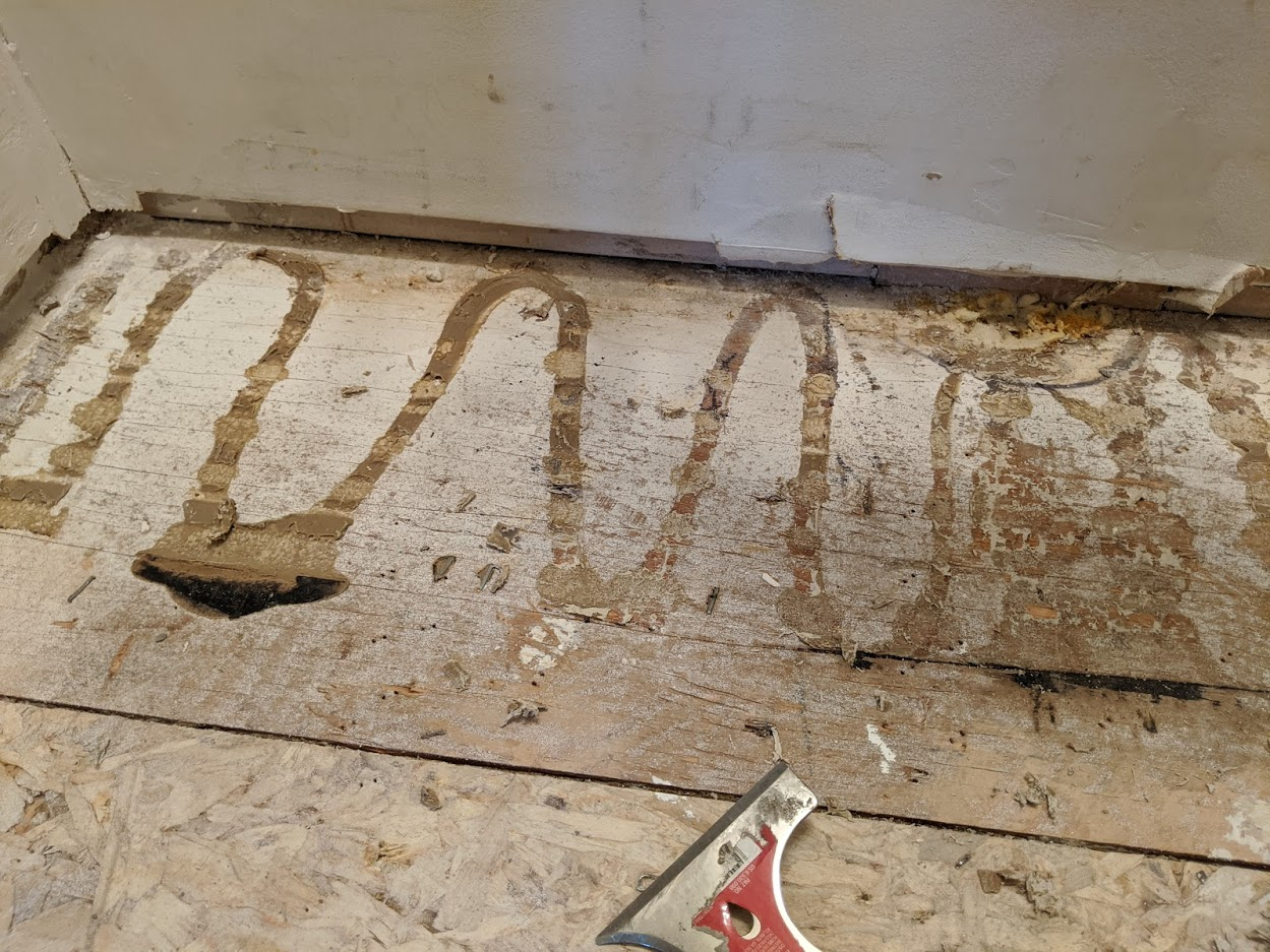 We scraped some leftover adhesive off the floor and tried to flatten it as much as possible. Since he wanted to do tile, the floor should be level to avoid any headaches.