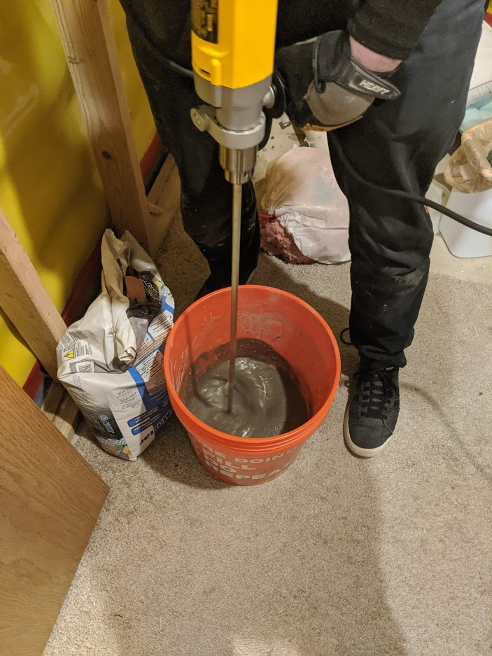 To put the Schluter down you use a cement mix called thinset which goes on top and forms the bed the tiles lay on. To mix thinset is a bit of a science so you have to follow the instructions. I had to leave for dinner but before I left, he showed me how to do it using a mixer: