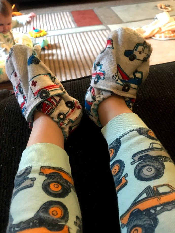 I was hooked. I loved the feel of letting the fabric go through the needle, of watching the pieces line up and become one. I had to do more. I decided to make our toddler some slippers. We took the kids to JoAnn Fabrics and I had Rami choose a fabric. Being a stereotypical two year old boy, he chose a firetruck pattern. I found an easy DIY pattern and went for it!