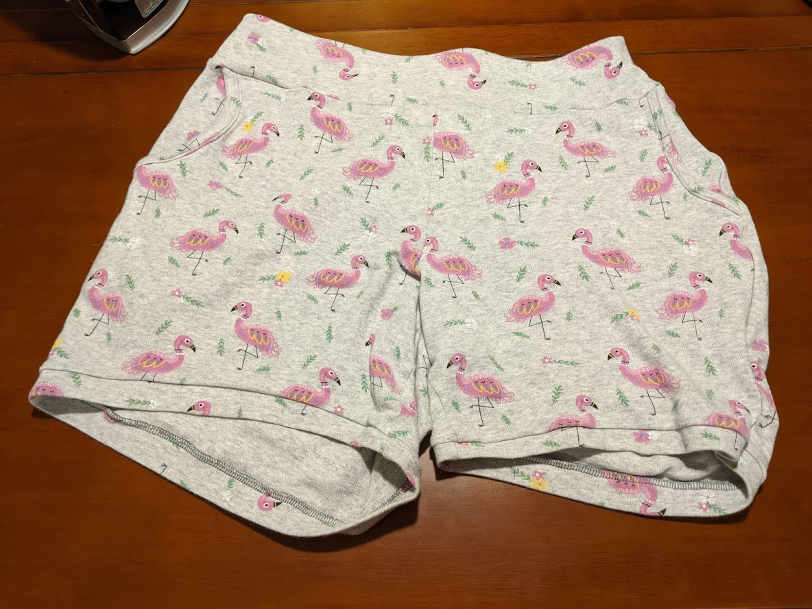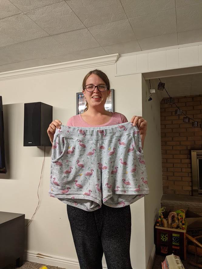 I decided to just use the large pattern for my jogger shorts, as I had already cut the pattern to that specification and I feel like my sister and I are not too far off from each other in size. However...the flamingo fabric did not translate well to a larger size, as it was sort of stretchy and the shorts ended up being insanely large. They actually felt like they were size XXL rather than just a large.