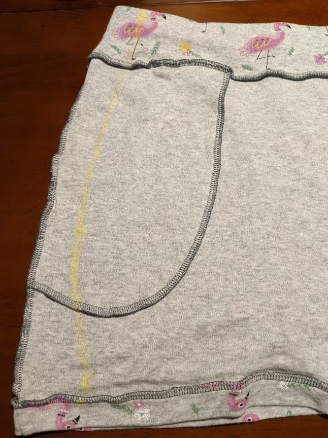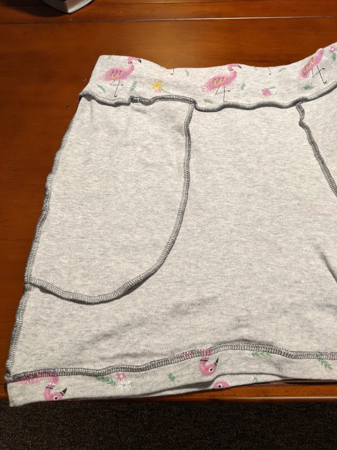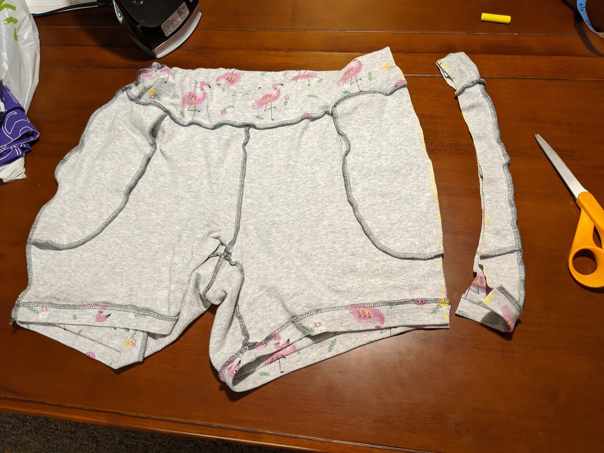 I sewed up the sides after cutting, and had to re-sew the pouch for the elastic, as I had cut right through that as well, including cutting off some of the elastic as well. I figured that would be the best way to do it, because the elastic also seemed to be too big. I like how the bottoms cinch in now, with the additional half-inch cut toward the bottom.