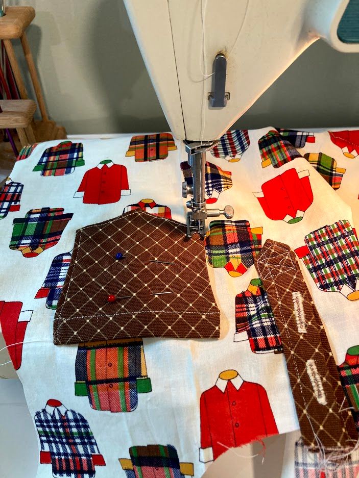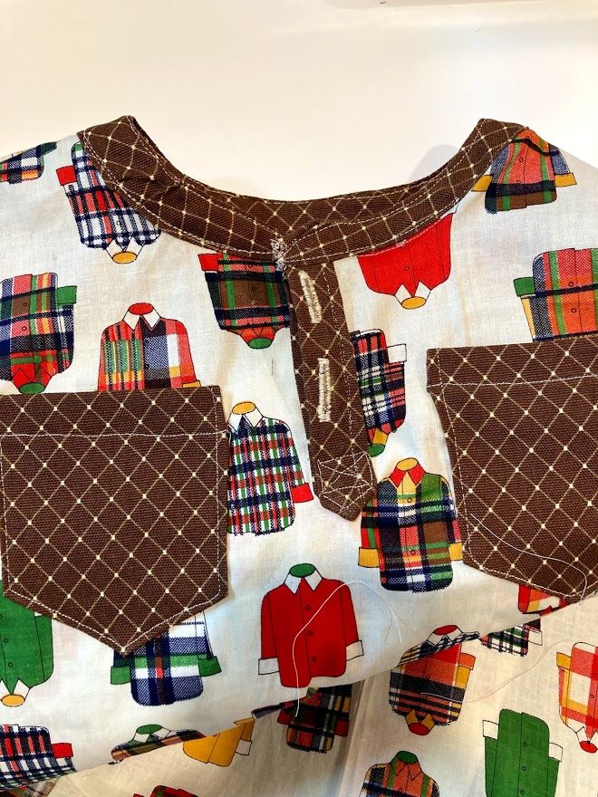 I next added the pockets. I found the brown fabric from another unfinished project that I sort of realized I would never finish. This was an easy way to get rid of it, and I think the brown matches that retro 70s vibe I'm going for here. The pockets were also simple, just basic pockets really. My lines are still not great (and look at that crooked buttonhole!) but they are vastly better than they were even a year ago. I hope to just keep getting better and better.
