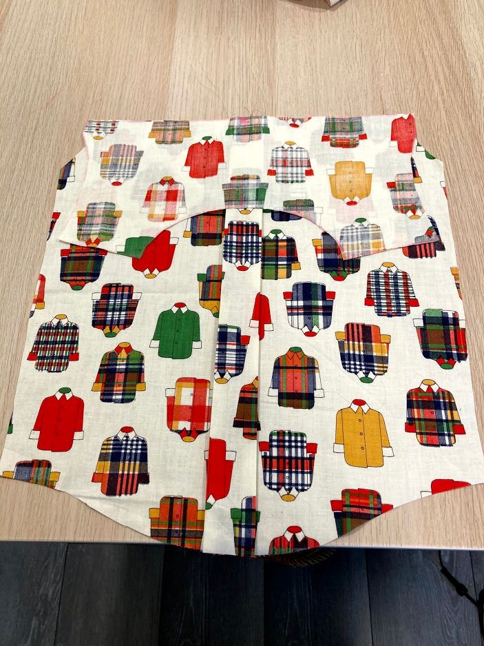 Next, I did the bottom back panel, and two top panels (they are upside down here, ready for sewing). You can see the ironed fold line I placed in the middle. This shirt is going to look so sharp on Rami. The top pieces were really interesting, and I hadn't done anything like them before. The panel of instructions that talks about how to fold up the bottom and top pieces inside the middle piece (I know that is confusing to read) was where I got a little lost, but after reading it about 3 times, I knew what it was saying. Maybe I'm just slow to learn new sewing skills, and it's an easy concept for others?