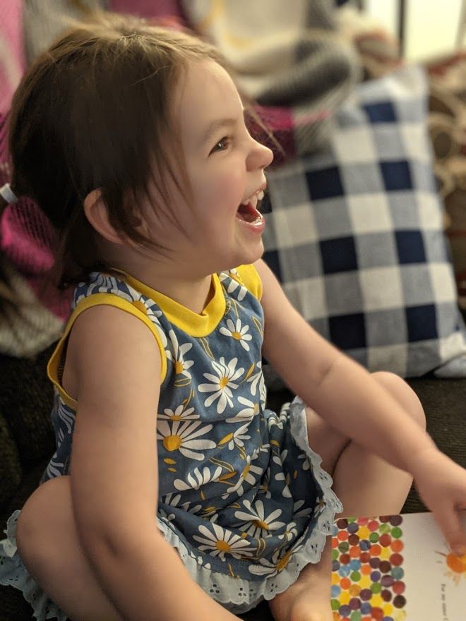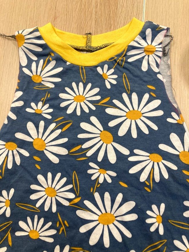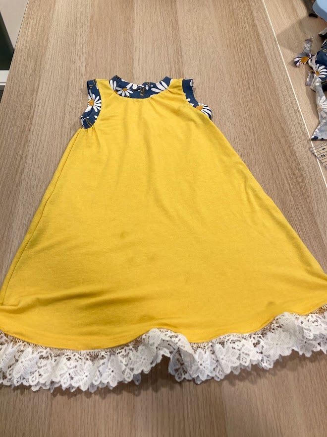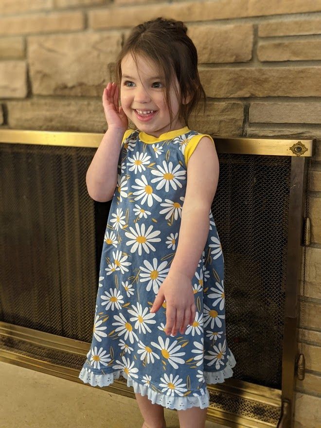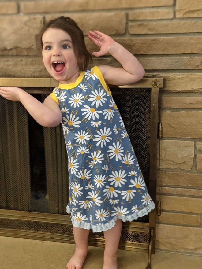 I ended up making two opposite nightgowns. One with yellow body and daisy details, and one with daisy body and yellow details. Saira definitely prefers the daisy nightgown but will wear them both.