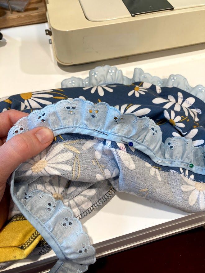 I took the yellow skirt from that project and the blue daisy fabric from my daisy dresses, and started to cut out the pieces of a nightgown. I used the Summer Nightie pattern from Sew Much Ado. It's simple and quick; seriously, I think with all steps done, it took me MAYBE an hour to do one whole nightie!