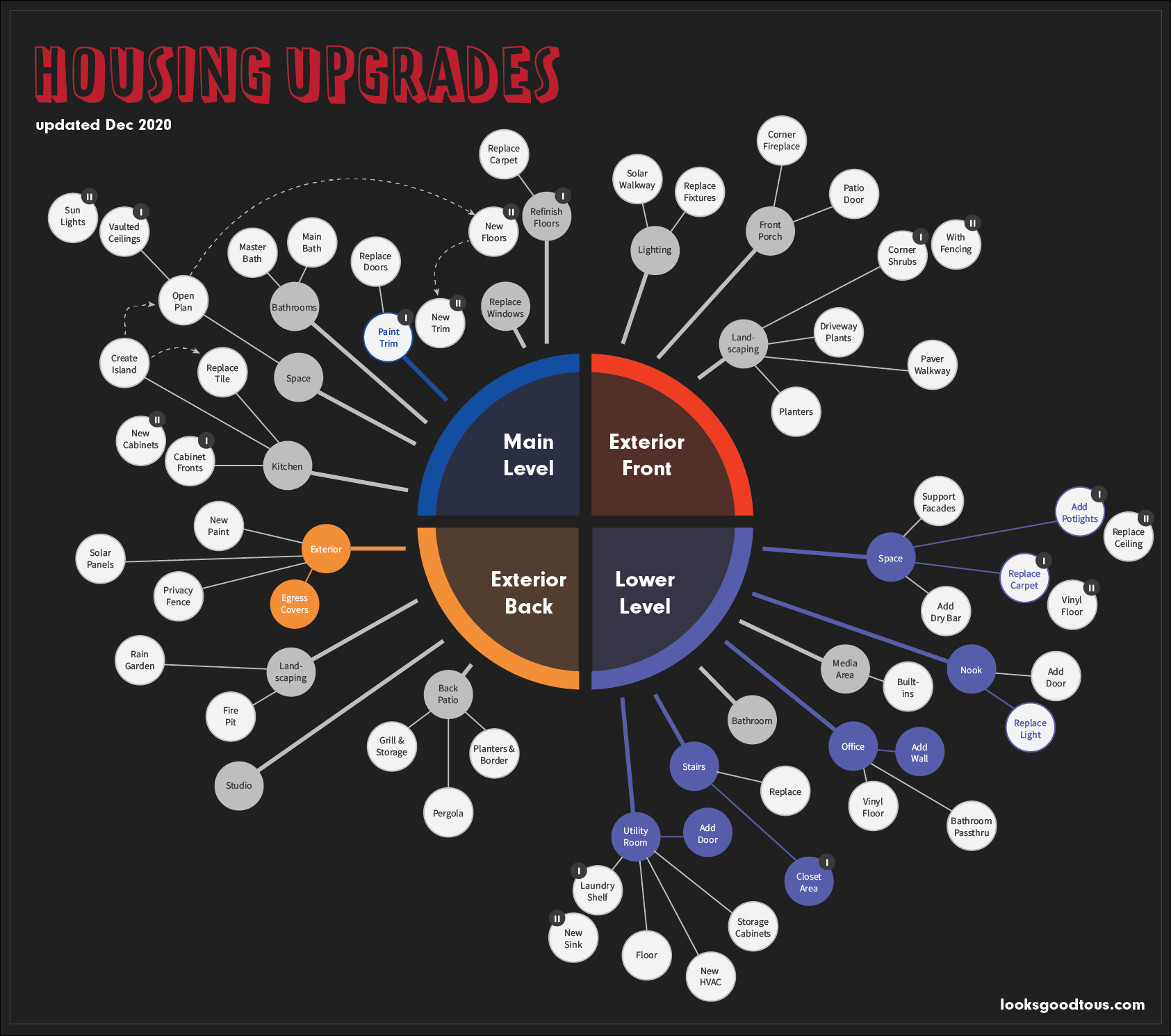 Stuff closer to the center is "smaller" and hopefully easier on the budget. The farther you get from the center, the more expensive and involved the projects become. Just like in a game, it'll be very unlikely we'll get even 50% of the projects done but I found this helps plan different updates and visualizes the relationship between things.